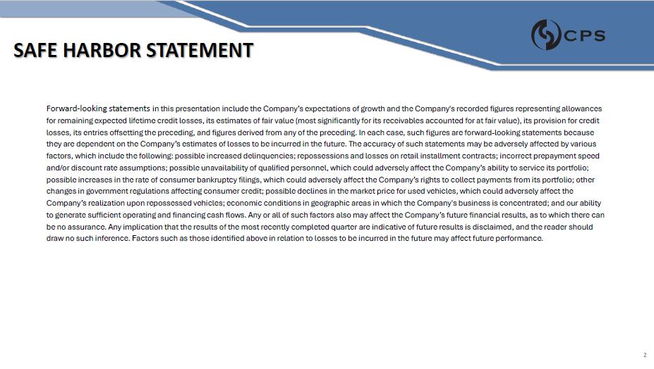 SAFE HARBOR STATEMENT Forward - looking statements in this presentation include the Company’s expectations of growth and the Company's recorded figures representing allowances for remaining expected lifetime credit losses, its estimates of fair value (most significantly for its receivables accounted for at fair value), its provision for credit losses, its entries offsetting the preceding, and figures derived from any of the preceding. In each case, such figures are forward - looking statements because they are dependent on the Company’s estimates of losses to be incurred in the future. The accuracy of such statements may be adversely affected by various factors, which include the following: possible increased delinquencies; repossessions and losses on retail installment contracts; incorrect prepayment speed and/or discount rate assumptions; possible unavailability of qualified personnel, which could adversely affect the Company’s ability to service its portfolio; possible increases in the rate of consumer bankruptcy filings, which could adversely affect the Company’s rights to collect payments from its portfolio; other changes in government regulations affecting consumer credit; possible declines in the market price for used vehicles, which could adversely affect the Company’s realization upon repossessed vehicles; economic conditions in geographic areas in which the Company's business is concentrated; and our ability to generate sufficient operating and financing cash flows. Any or all of such factors also may affect the Company’s future financial results, as to which there can be no assurance. Any implication that the results of the most recently completed quarter are indicative of future results is disclaimed, and the reader should draw no such inference. Factors such as those identified above in relation to losses to be incurred in the future may affect future performance. 2