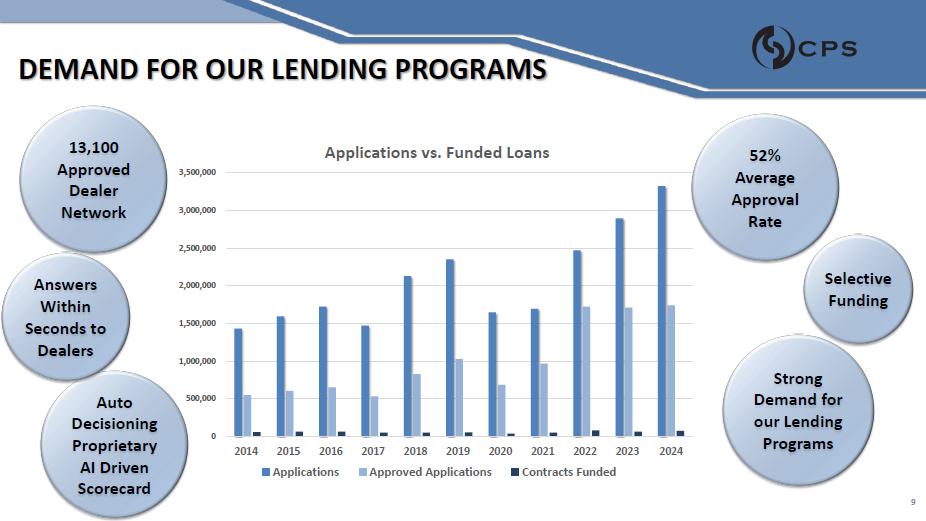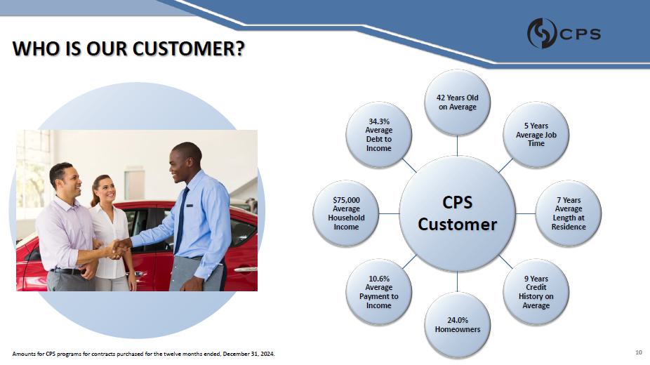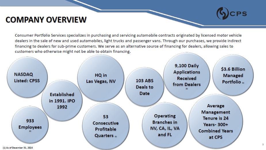 COMPANY OVERVIEW Consumer Portfolio Services specializes in purchasing and servicing automobile contracts originated by licensed motor vehicle dealers in the sale of new and used automobiles, light trucks and passenger vans. Through our purchases, we provide indirect financing to dealers for sub - prime customers. We serve as an alternative source of financing for dealers, allowing sales to customers who otherwise might not be able to obtain financing. $3.6 Billion Managed Portfolio (1) NASDAQ Listed: CPSS Average Management Tenure is 24 Years - 300+ Combined Years at CPS HQ in Las Vegas, NV Operating Branches in NV, CA, IL, VA and FL 933 Employees (1) 9,100 Daily Applications Received from Dealers (1) Established in 1991. IPO 1992 53 Consecutive Profitable Quarters (1) 103 ABS Deals to Date (1) As of December 31, 2024 3