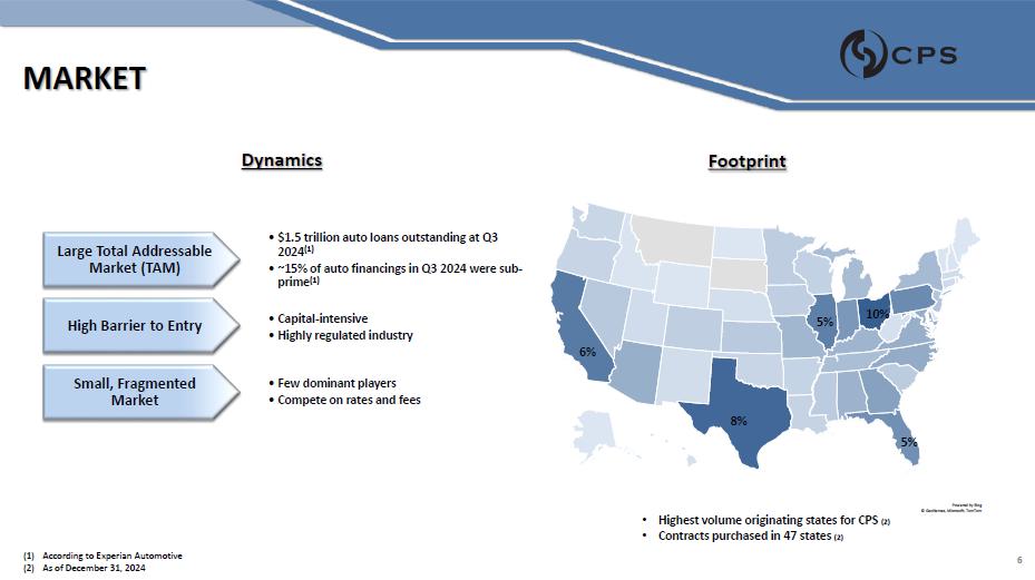 LEADERSHIP Charles “Brad” Bradley CEO, Chairman of the Board • CEO since 1992 • Chairman of the Board since 2001 • 33 years at CPS Mike Lavin President, COO, CLO • President since 2022 • COO since 2019. CLO since 2014 • 23 Years at CPS Danny Bharwani CFO • CFO since 2022 • 27 years at CPS CPS’ senior management team consists of 13 executives that are led by Brad, Mike and Danny. Each has significant industry experience and, on average, 24 years with CPS. Combined, senior management has over 300 years of auto lending experience just at CPS . 5