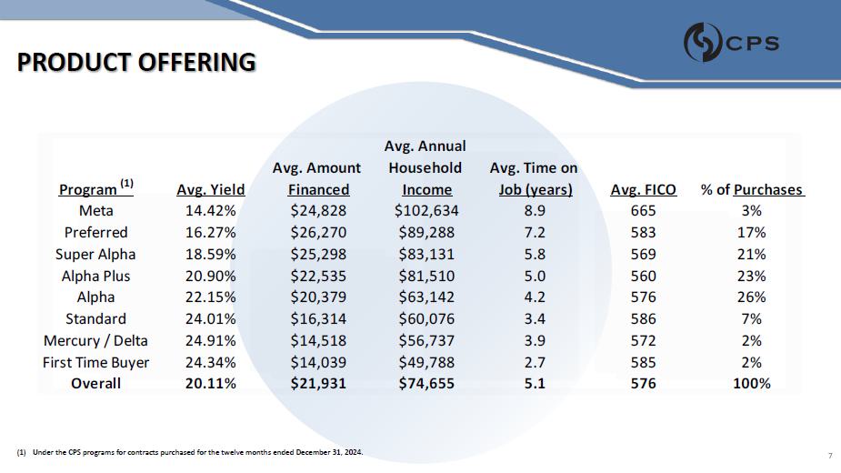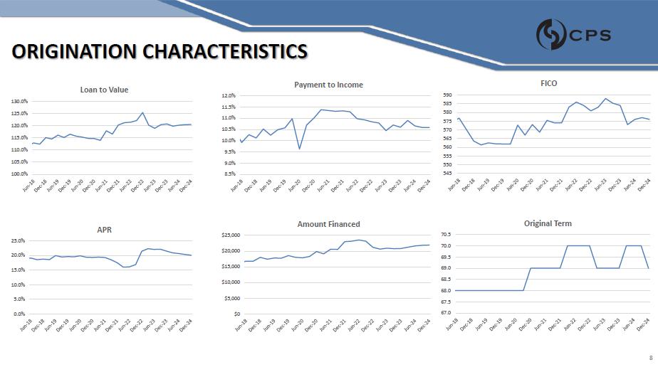 PRODUCT OFFERING Meta 14.42% $102,634 3% Preferred 16.27% $89,288 17% Super Alpha 18.59% $83,131 21% Alpha Plus 20.90% $81,510 23% Alpha 22.15% $63,142 26% Standard 24.01% $60,076 7% Mercury / Delta 24.91% $56,737 2% First Time Buyer 24.34% $49,788 2% Overall 20.11% $25,298 $22,535 $20,379 $16,314 $14,518 $14,039 $21,931 $74,655 583 569 560 576 586 572 585 576 100% % of Purchases Avg. Yield Program (1) Avg. Amount Financed $24,828 $26,270 Avg. Annual Household Income Avg. Time on Job (years) 8.9 7.2 5.8 5.0 4.2 3.4 3.9 2.7 5.1 Avg. FICO 665 (1) Under the CPS programs for contracts purchased for the twelve months ended December 31, 2024. 7