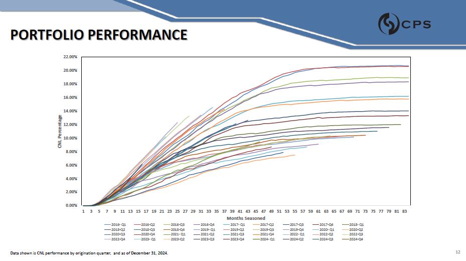 PORTFOLIO PERFORMANCE Data shown is CNL performance by origination quarter, and as of December 31, 2024. 12 22.00% 20.00% 18.00% 16.00% 14.00% 12.00% 10.00% 8.00% 6.00% 4.00% 2.00% 0.00% CNL Percentage 1 3 5 7 9 11 13 15 17 19 21 23 25 27 29 31 33 35 37 39 41 43 45 47 49 51 53 55 57 59 61 63 65 67 69 71 73 75 77 79 81 83 Months Seasoned 2016 - Q1 2018 - Q2 2020 - Q3 2022 - Q4 2016 - Q2 2018 - Q3 2020 - Q4 2023 - Q1 2016 - Q3 2018 - Q4 2021 - Q1 2023 - Q2 2016 - Q4 2019 - Q1 2021 - Q2 2023 - Q3 2017 - Q1 2019 - Q2 2021 - Q3 2023 - Q4 2017 - Q2 2019 - Q3 2021 - Q4 2024 - Q1 2017 - Q3 2019 - Q4 2022 - Q1 2024 - Q2 2017 - Q4 2020 - Q1 2022 - Q2 2024 - Q3 2018 - Q1 2020 - Q2 2022 - Q3 2024 - Q4