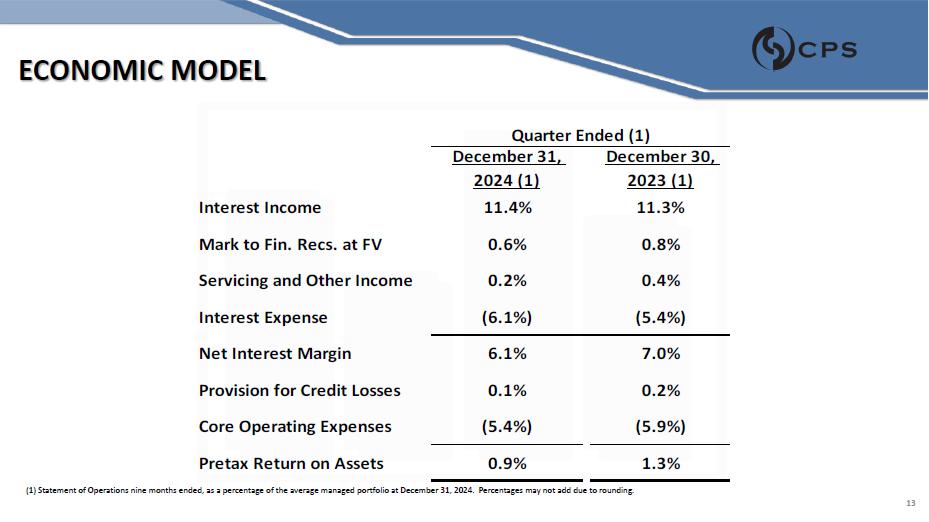 ECONOMIC MODEL Interest Income 2024 (1) 2023 (1) 11.4% 11.3% Mark to Fin. Recs. at FV Servicing and Other Income Interest Expense Net Interest Margin Provision for Credit Losses Core Operating Expenses 0.6% 0.8% 0.2% 0.4% (6.1%) (5.4%) 6.1% 7.0% 0.1% 0.2% (5.4%) (5.9%) Quarter Ended (1) December 31, December 30, Pretax Return on Assets 0.9% 1.3% (1) Statement of Operations nine months ended, as a percentage of the average managed portfolio at December 31, 2024. Percentages may not add due to rounding. 13