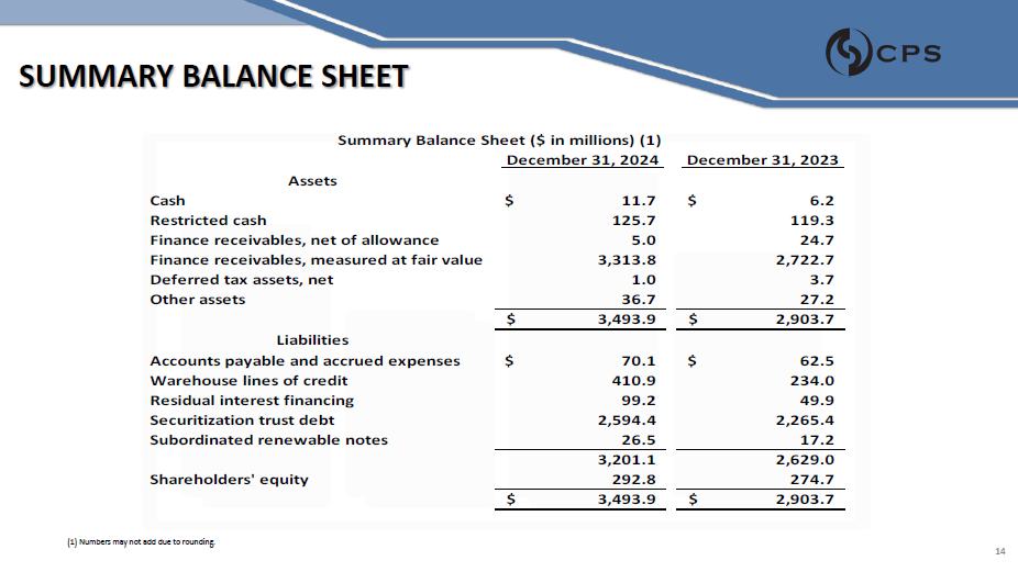 SUMMARY BALANCE SHEET December 31, 2024 December 31, 2023 Assets Cash $ $ Restricted cash Finance receivables, net of allowance 6.2 119.3 24.7 Finance receivables, measured at fair value 2,722.7 Deferred tax assets, net 3.7 Other assets 11.7 125.7 5.0 3,313.8 1.0 36.7 27.2 3,493.9 $ 2,903.7 $ Liabilities Accounts payable and accrued expenses $ 62.5 $ Warehouse lines of credit 234.0 Residual interest financing 49.9 Securitization trust debt 2,265.4 Subordinated renewable notes 70.1 410.9 99.2 2,594.4 26.5 17.2 2,629.0 Shareholders' equity 3,201.1 292.8 274.7 3,493.9 $ 2,903.7 $ Summary Balance Sheet ($ in millions) (1) (1) Numbers may not add due to rounding . 14