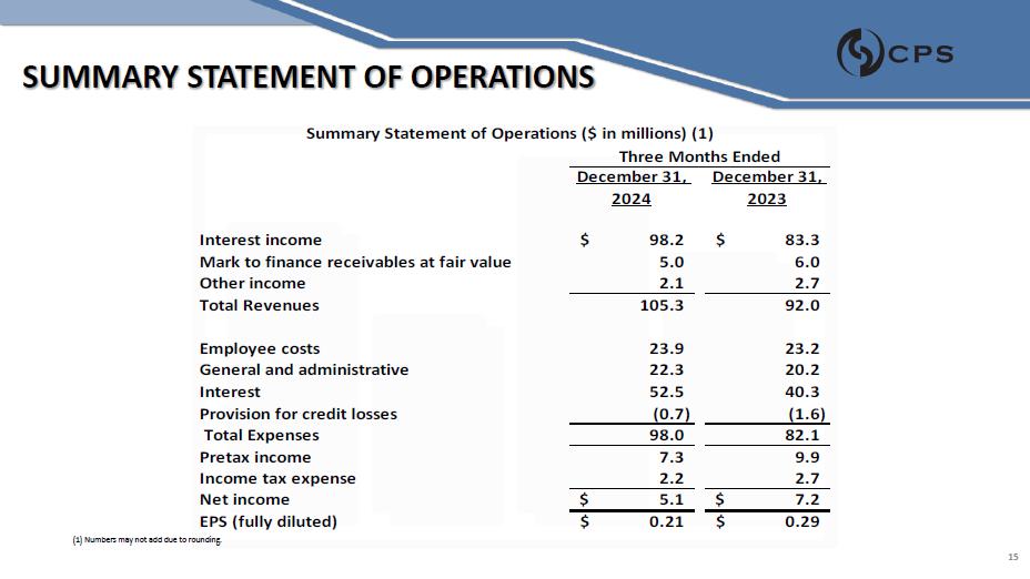 SUMMARY STATEMENT OF OPERATIONS (1) Numbers may not add due to rounding. Interest income Mark to finance receivables at fair value $ 98.2 $ 83.3 5.0 Other income 2.1 6.0 2.7 Total Revenues 105.3 92.0 Employee costs 23.9 23.2 General and administrative 22.3 20.2 Interest 52.5 40.3 Provision for credit losses (0.7) (1.6) Total Expenses 98.0 82.1 Pretax income 7.3 Income tax expense 2.2 9.9 2.7 Net income 5.1 $ 7.2 $ EPS (fully diluted) 0.21 $ 0.29 $ Summary Statement of Operations ($ in millions) (1) Three Months Ended December 31, December 31, 2024 2023 15