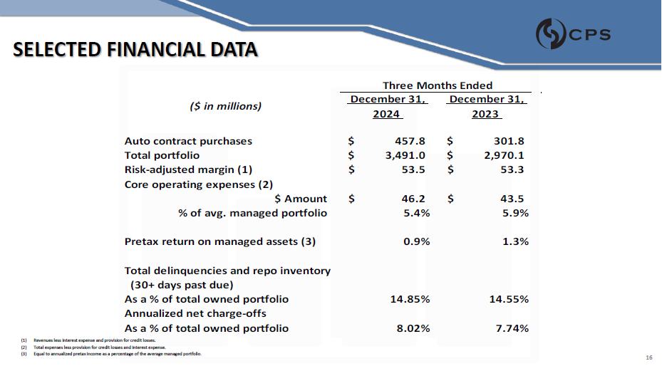 SELECTED FINANCIAL DATA ($ in millions) December 31, 2024 December 31, 2023 Auto contract purchases 457.8 Total portfolio 3,491.0 Risk - adjusted margin (1) 53.5 $ $ $ Core operating expenses (2) $ Amount 46.2 $ % of avg. managed portfolio 5.4% $ 301.8 $ 2,970.1 $ 53.3 $ 43.5 5.9% Pretax return on managed assets (3) 0.9% 1.3% Total delinquencies and repo inventory (30+ days past due) As a % of total owned portfolio 14.85% 14.55% Annualized net charge - offs As a % of total owned portfolio 8.02% 7.74% Three Months Ended Total expenses less provision for credit losses and interest expense. (1) Revenues less interest expense and provision for credit losses. (2) (3) Equal to annualized pretax income as a percentage of the average managed portfolio . 16