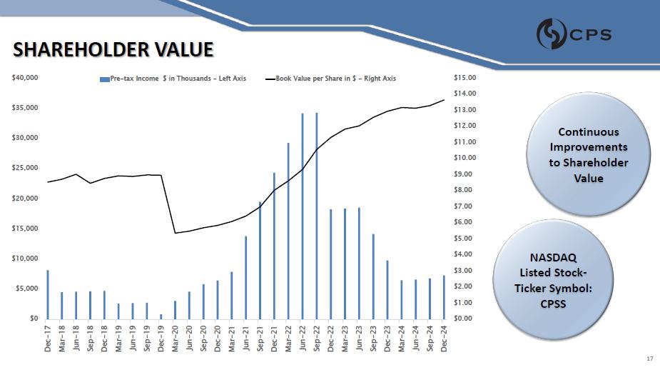SHAREHOLDER VALUE Continuous Improvements to Shareholder Value NASDAQ Listed Stock - Ticker Symbol: CPSS $0 $5,000 $10,000 $15,000 $20,000 $25,000 $30,000 $35,000 $40,000 Dec - 17 Mar - 18 Jun - 18 Sep - 18 Dec - 18 Mar - 19 Jun - 19 Sep - 19 Dec - 19 Mar - 20 Jun - 20 Sep - 20 Dec - 20 Mar - 21 Jun - 21 Sep - 21 Dec - 21 Mar - 22 Jun - 22 Sep - 22 Dec - 22 Mar - 23 Jun - 23 Sep - 23 Dec - 23 Mar - 24 Jun - 24 Sep - 24 Dec - 24 $0.00 $1.00 $2.00 $3.00 $4.00 $5.00 $7.00 $6.00 $8.00 $9.00 $10.00 $11.00 $12.00 $13.00 $14.00 $15.00 Pre - tax Income $ in Thousands - Left Axis Book Value per Share in $ - Right Axis 17