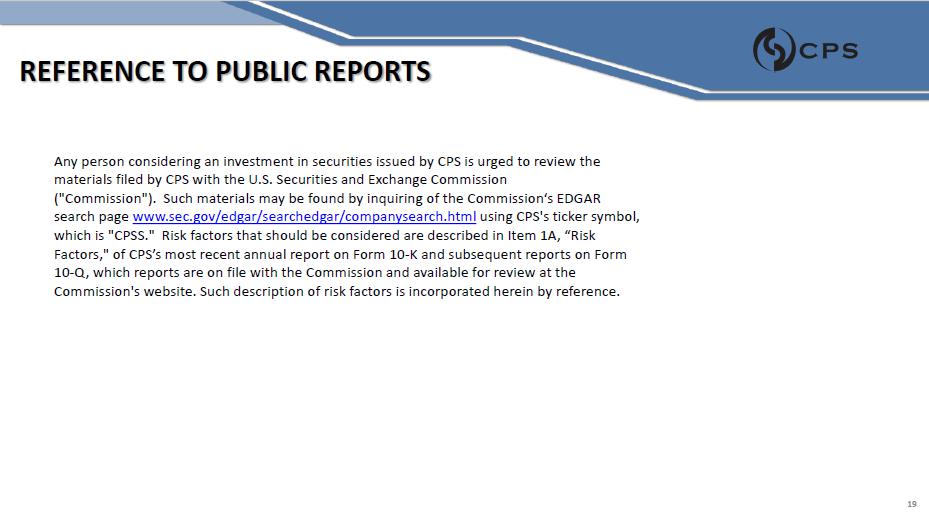 INVESTMENT OUTLOOK Continuous Growth Strong macroeconomic factors AI - driven Originations Scorecard Strong Fundamentals • 3.3 million applications in 2024 • $1.68 billion in sub - prime auto contracts funded in 2024 • Managed portfolio is at largest amount in company history • Raised Wtd. Avg APRs in originations from 17.72% in Dec 2022 to 20.11% in December 2024 • Favorable demand for used vehicles • New vehicle pricing increase and increasing sales despite rising interest rates • Improves efficiency and customer satisfaction • Upcoming AI Scorecard Refresh (refresh every 18 - 24 months) • Industry leading technology in all facets of our business • Decreased leverage on the portfolio puts CPS in a position to grow faster than competitors • Increasing shareholder equity - highest in company history • Decreasing core operating expenses, while portfolio grows Investor Relations Contact Tom Colton and Alec Wilson Gateway Group, Inc. Phone: 949 - 574 - 3860 Email: CPSS@gateway - grp.com 18