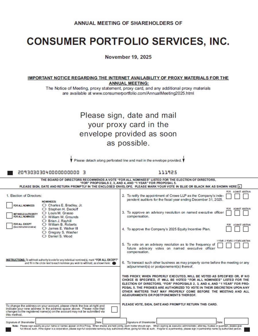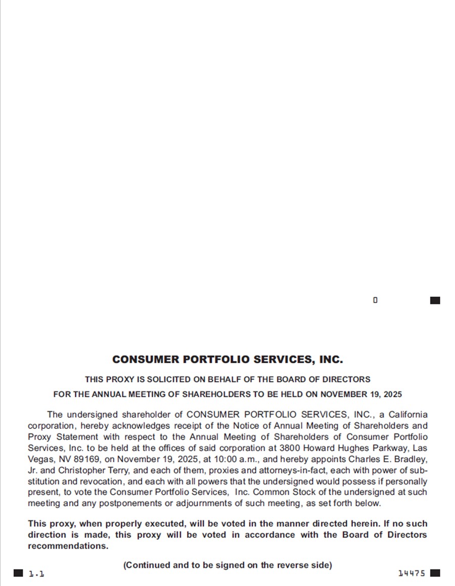 The annual meeting of the shareholders of Consumer Portfolio Services, Inc. (the “Company”) will be held at 10:00 a.m., local time, on Wednesday, November 19, 2025, at the Company’s Nevada office at 3800 Howard Hughes Parkway, Suite 1400, Las Vegas, Nevada 89169, for the following purposes: